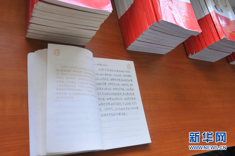 7月18日,網(wǎng)絡媒體國防行記者團參觀武警廣東總隊河源市支隊和平縣中隊。圖為中隊官兵日常使用的《手抄系列講話筆記本》。新華網(wǎng)記者 黃河攝
