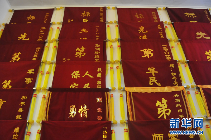 7月18日,網(wǎng)絡媒體國防行記者團參觀武警廣東總隊河源市支隊和平縣中隊。圖為中隊榮譽室中擺放著的部分錦旗。新華網(wǎng)記者 黃河攝