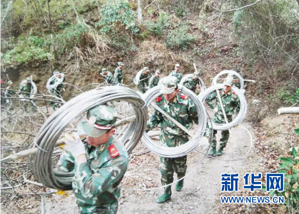 2008年2月,受冰凍災害影響,和平縣電網(wǎng)遭不同程度損壞,為加快搶修電路,和平中隊官兵用自己雙手將近10噸重的導線抬到近千米高的上陵羊角石峰地段。新華網(wǎng)發(fā)(和平中隊供圖)