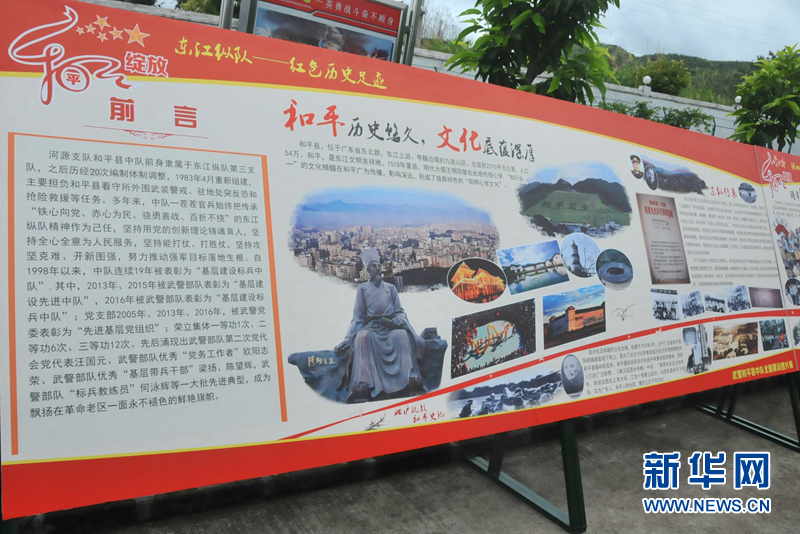 7月18日,網(wǎng)絡媒體國防行記者團參觀武警廣東總隊河源市支隊和平縣中隊。圖為營區(qū)院內介紹中隊歷史的展板。新華網(wǎng)記者 黃河攝