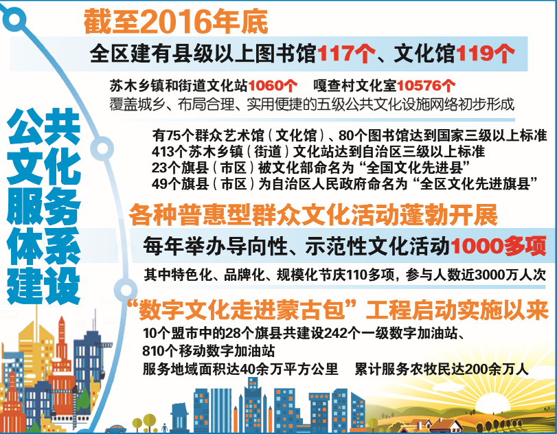 “數(shù)字文化走進(jìn)蒙古包”工程實(shí)施以來,已在全區(qū)10個(gè)盟市的28個(gè)旗縣建設(shè)了242個(gè)一級(jí)數(shù)字加油站、810個(gè)移動(dòng)數(shù)字加油站,服務(wù)地域面積達(dá)40余萬平方公里,累計(jì)服務(wù)農(nóng)牧民200余萬人。2015年,這一工程被列入文化部科技創(chuàng)新項(xiàng)目。