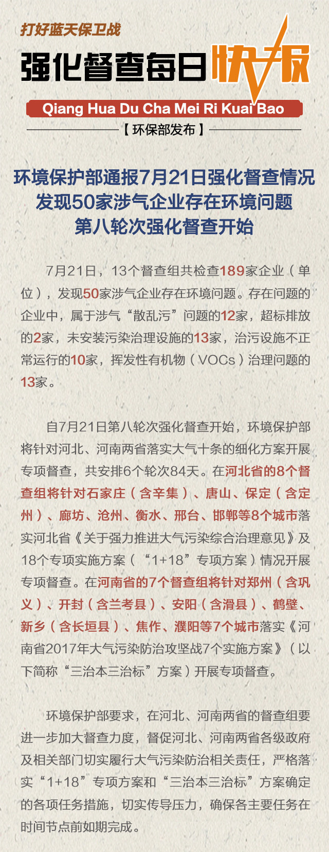 中新網(wǎng)7月23日電 據(jù)環(huán)境保護部宣傳教育司官方微博消息,環(huán)保部針對京津冀及周邊地區(qū)的強化環(huán)保督查,7月21日,13個督查組共檢查189家企業(yè)(單位),發(fā)現(xiàn)50家涉氣企業(yè)存在環(huán)境問題。