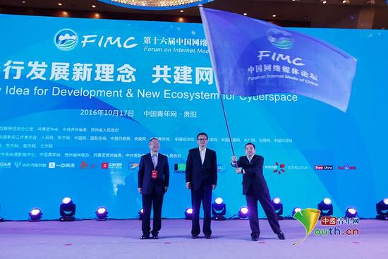 第十七屆中國網(wǎng)絡(luò)媒體論壇承辦方、中國經(jīng)濟(jì)網(wǎng)總裁王旭東(右)揮舞著從國家互聯(lián)網(wǎng)信息辦公室網(wǎng)絡(luò)新聞信息傳播局局長姜軍(中)手中接過的旗幟。 中國青年網(wǎng)記者 張炎良 攝