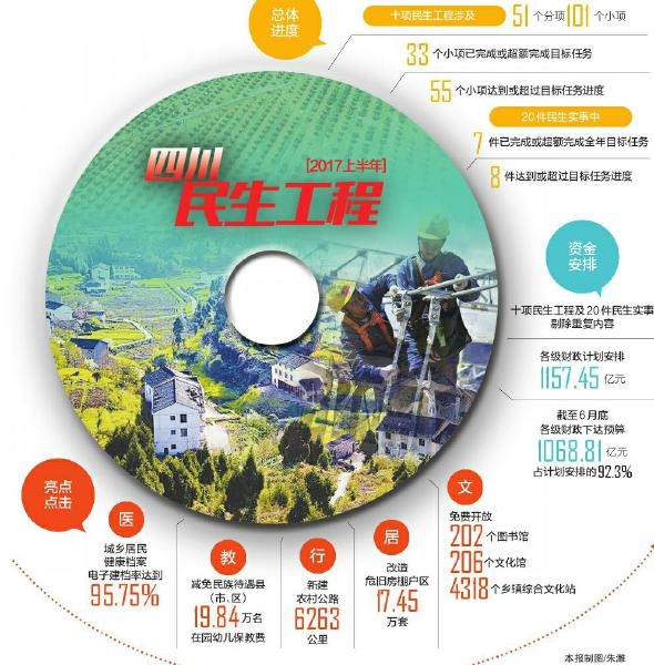 8月初,四川省政府督查室發(fā)布上半年四川省民生工程完成情況顯示,上半年十項民生工程涉及的51個分項101個小項中,有33個小項已完成或超額完成目標(biāo)任務(wù),55個小項達(dá)到或超過目標(biāo)任務(wù)進(jìn)度。20件民生實事中,有7件已完成或超額完成全年目標(biāo)任務(wù),8件達(dá)到或超過目標(biāo)任務(wù)進(jìn)度。