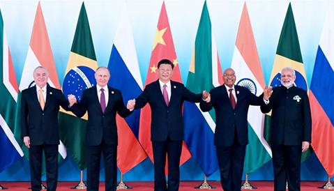 9月4日,金磚國家領(lǐng)導(dǎo)人第九次會晤在廈門國際會議中心舉行。國家主席習(xí)近平主持會晤并發(fā)表題為《深化金磚伙伴關(guān)系 開辟更加光明未來》的重要講話。南非總統(tǒng)祖馬、巴西總統(tǒng)特梅爾、俄羅斯總統(tǒng)普京、印度總理莫迪出席。這是金磚國家領(lǐng)導(dǎo)人集體合影。(圖片來源:新華社)
