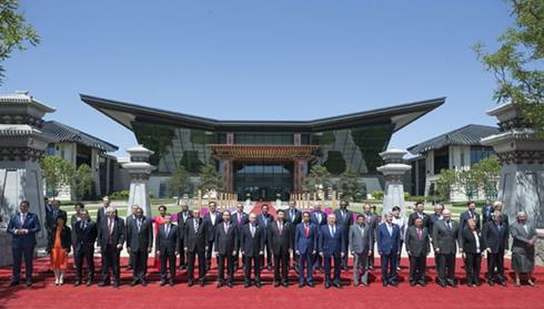 5月15日,“一帶一路”國際合作高峰論壇在北京雁棲湖國際會議中心舉行圓桌峰會,國家主席習(xí)近平主持會議并致辭。這是當(dāng)天中午,習(xí)近平同與會領(lǐng)導(dǎo)人和國際組織負(fù)責(zé)人以國際會議中心“漢唐飛揚(yáng)”主建筑為背景集體合影。(來源:新華網(wǎng))