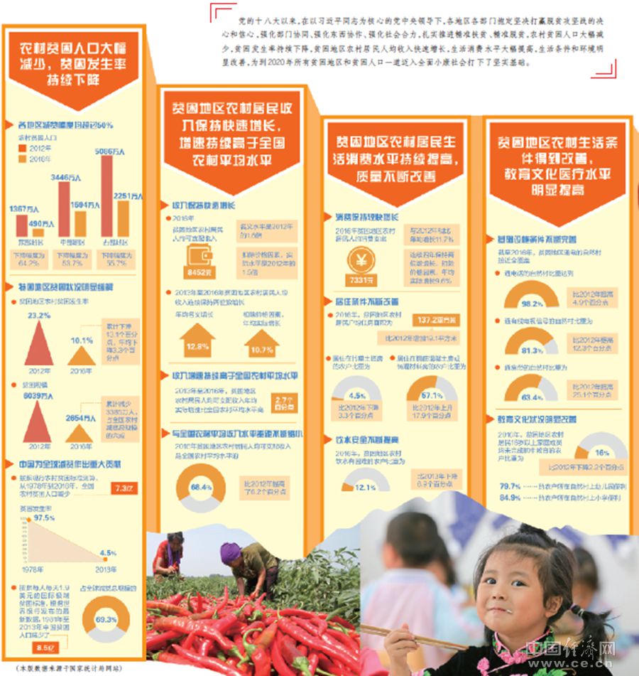 黨的十八大以來,在以習(xí)近平同志為核心的黨中央領(lǐng)導(dǎo)下,各地區(qū)各部門抱定堅(jiān)決打贏脫貧攻堅(jiān)戰(zhàn)的決心和信心,強(qiáng)化部門協(xié)同、強(qiáng)化東西協(xié)作、強(qiáng)化社會合力,扎實(shí)推進(jìn)精準(zhǔn)扶貧、精準(zhǔn)脫貧,農(nóng)村貧困人口大幅減少,貧困發(fā)生率持續(xù)下降,貧困地區(qū)農(nóng)村居民人均收入快速增長,生活消費(fèi)水平大幅提高,生活條件和環(huán)境明顯改善,為到2020年所有貧困地區(qū)和貧困人口一道邁入全面小康社會打下了堅(jiān)實(shí)基礎(chǔ)。(數(shù)據(jù)來源于國家統(tǒng)計(jì)局網(wǎng)站)