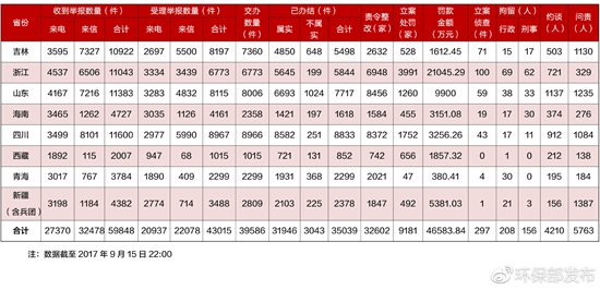截至2017年9月15日,督察組交辦的環(huán)境舉報,地方已辦結(jié)35039件,辦結(jié)率達(dá)到88.5%。其中,責(zé)令整改32602家;立案處罰9181家,罰款46583.84萬元;立案偵查297件,行政和刑事拘留364人;約談4210人,問責(zé)5763人。