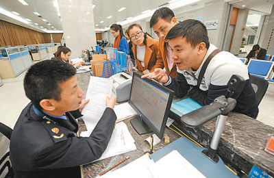 平潭片區(qū)綜合服務大廳內(nèi),注冊企業(yè)人士在向辦事人員咨詢辦事信息。
