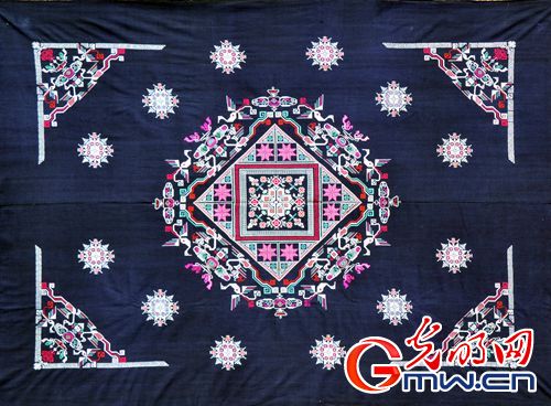 挑花(黃梅挑花) 挑花是一種具有極強(qiáng)裝飾性的刺繡工藝。黃梅挑花又名架子花、十字挑花,廣泛流傳于湖北省黃梅縣。黃梅挑花不同于一般刺繡,刺繡重刺,挑花重挑。黃梅挑花以元青布作底,用針將五彩絲線挑繡在底布經(jīng)線和緯線交織的網(wǎng)格上,形成色澤絢麗、立體感強(qiáng)的圖案。其中,針腳為“×”字形的稱“十字繡”,針腳為“一”字形的稱平線繡。