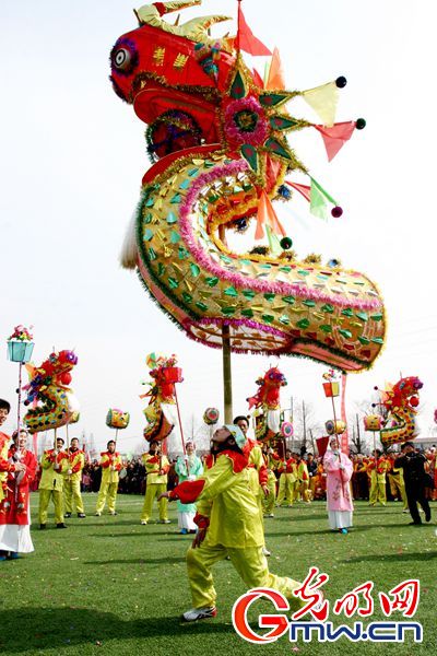 龍舞(高龍) 漢陽高龍是湖北特有的一種龍燈藝術(shù),盛行于武漢市漢陽區(qū)的江堤鄉(xiāng)、永豐鄉(xiāng)及蔡甸區(qū)部分地區(qū)。它起源于唐代貞觀年間,至今已有1400多年的歷史。漢陽高龍采用豎式舞法,與其他各種龍燈均不相同,其扎制及相關(guān)的焚燒搶福活動(dòng)也頗具特色。漢陽高龍于1999年應(yīng)邀晉京參加中華舞龍大賽,獲得全國首屆民間藝術(shù)最高獎(jiǎng)“山花獎(jiǎng)”第一名。