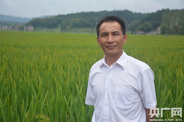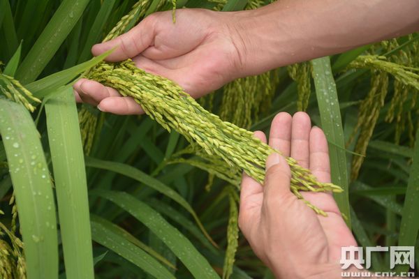 那是一綹飽滿的穗子,上頭的皮兒都裂開了,細小的白稻花在微風(fēng)中搖曳著。48歲的農(nóng)民王化永蹲了下去,用手輕輕地托起它,滿臉自豪地對央廣網(wǎng)記者說:“雜交水稻的自花授粉率就是高,你看稻穗這么大,笑得彎下了腰!