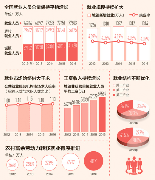 就業(yè)規(guī)模持續(xù)擴(kuò)大,就業(yè)結(jié)構(gòu)不斷優(yōu)化?串a(chǎn)業(yè)分布,服務(wù)業(yè)成為吸納就業(yè)主體?闯青l(xiāng)分布,城鎮(zhèn)就業(yè)人員比重由2012年的48.4%提高到2016年的53.4%,鄉(xiāng)村就業(yè)比例降為46.6%,城鄉(xiāng)就業(yè)格局發(fā)生歷史性轉(zhuǎn)變。