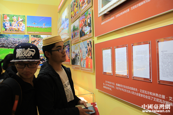 回族少年郭寶福(右)與同學(xué)在少數(shù)民族事業(yè)發(fā)展片區(qū)參觀。(中國(guó)臺(tái)灣網(wǎng) 李寧 攝)