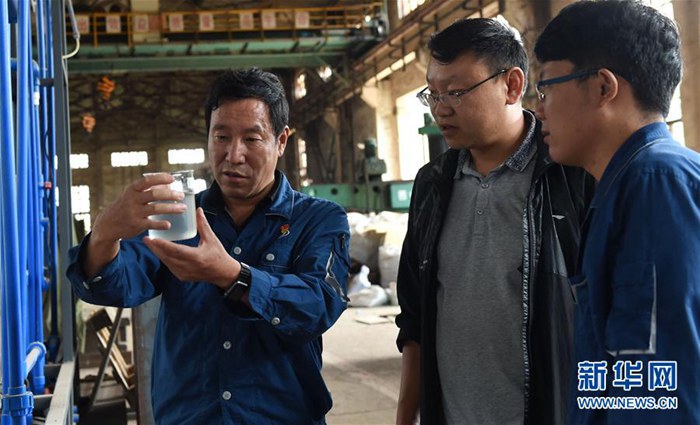 云南冶金昆明重工有限公司首席技師耿家盛(左)在車間里和助手查看生態(tài)環(huán)保廁所的沖水系統(tǒng)經(jīng)過循環(huán)后的水質(zhì)(9月22日攝)。新華社記者 藺以光 攝