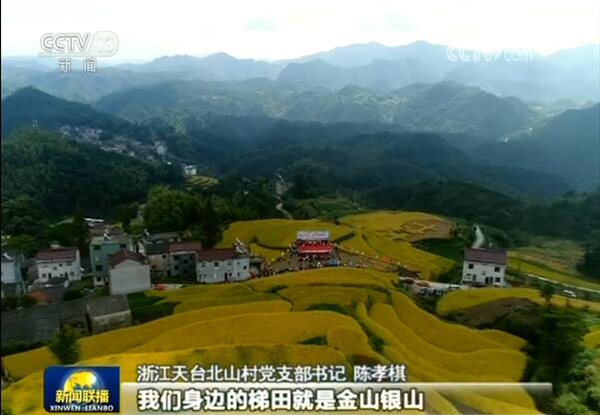 在浙江天臺(tái)蒼山南麓的北山村,一年一度的香米節(jié)正式開(kāi)鐮,村民在慶祝豐收的同時(shí),也將喜迎十九大的喜悅心情刻在了梯田上、稻田里。