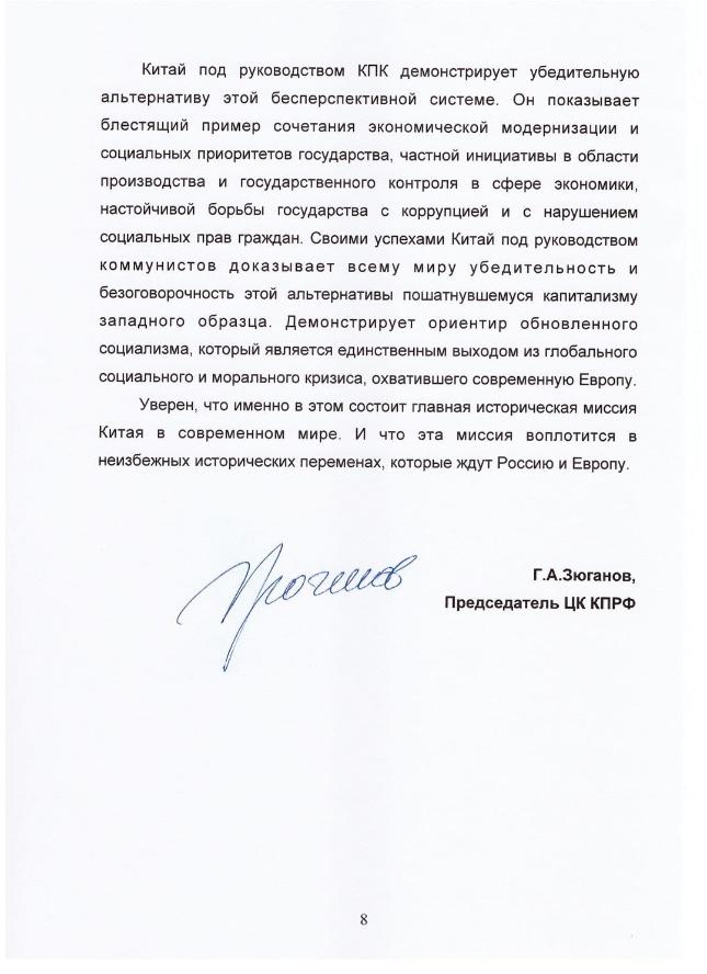 久加諾夫認為,中國共產(chǎn)黨理論的力量與成果在于它以最好的方式將幾個世紀里的中華文明的經(jīng)驗與現(xiàn)代國家建設融合在自己的國家政治與經(jīng)濟生活建設中。這使得中國不僅可以適應不停變化的世界的召喚,同時也可以在當今世界占據(jù)顯著地位。堅持中華傳統(tǒng)與現(xiàn)代化結(jié)合,將國家利益與社會利益作為自己前進的目標,因此中國共產(chǎn)黨才成為當代世界比較強大的執(zhí)政黨,也一定能夠向著更高的目標前進。