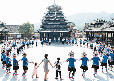 近年來,廣西三江侗族自治縣大力推進(jìn)旅游扶貧工程,將侗族濃郁獨(dú)特的歌舞文化等民俗風(fēng)情轉(zhuǎn)化為招攬游客的“法寶”。圖為在三江侗族自治縣林溪鎮(zhèn)冠洞村冠小屯,人們?cè)跉g跳多耶舞。