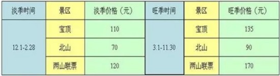 萬年索道:淡季:上行30元/人,下行20元/人。旺季:上行65元/人,下行45元/人。