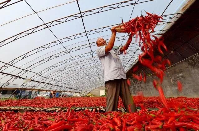 △河北省邯鄲市雞澤縣魏青村村民在晾曬辣椒(2017年9月11日攝)。