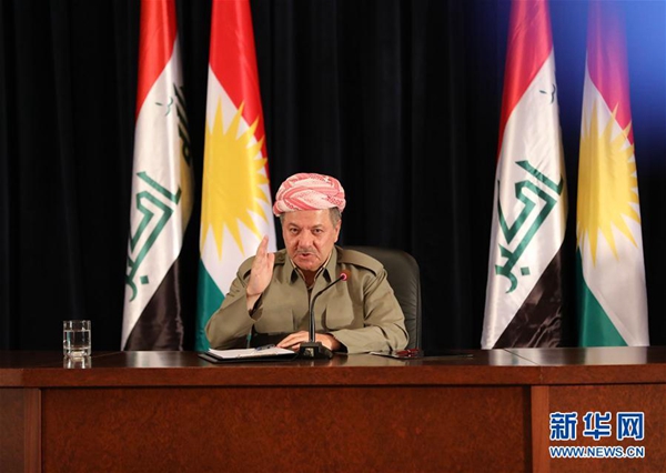 資料圖:9月24日,在伊拉克埃爾比勒,伊拉克庫(kù)爾德自治區(qū)(庫(kù)區(qū))主席馬蘇德·巴爾扎尼出席記者會(huì)。新華網(wǎng)發(fā)(哈利勒·達(dá)伍德攝)