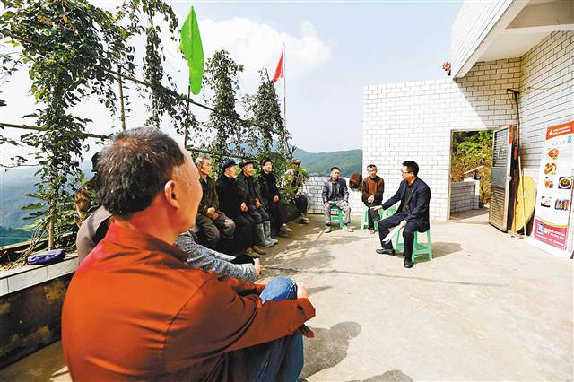 楊大可(右一)結(jié)合身邊實(shí)際,向村民宣講十九大精神。 (云陽報社供圖)