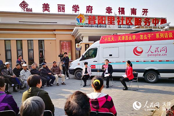 “兩位‘書記’都是十九大代表,給我們分享一下聽完十九報(bào)告后的感受吧!痹谖絷柪锷鐓^(qū)居委會門前廣場,南開區(qū)委書記姚來英和社區(qū)黨委書記王月華,與社區(qū)居民代表圍坐在一起,不僅要接受主持人的采訪,還要解答居民隨時(shí)拋來的問題。一個(gè)多小時(shí)的互動交流,不是照本宣科,更像是“拉家!,平實(shí)的語言、生動的描述,讓居民們更直觀地領(lǐng)會十九大精神,對今后的生活更是充滿期待和向往。