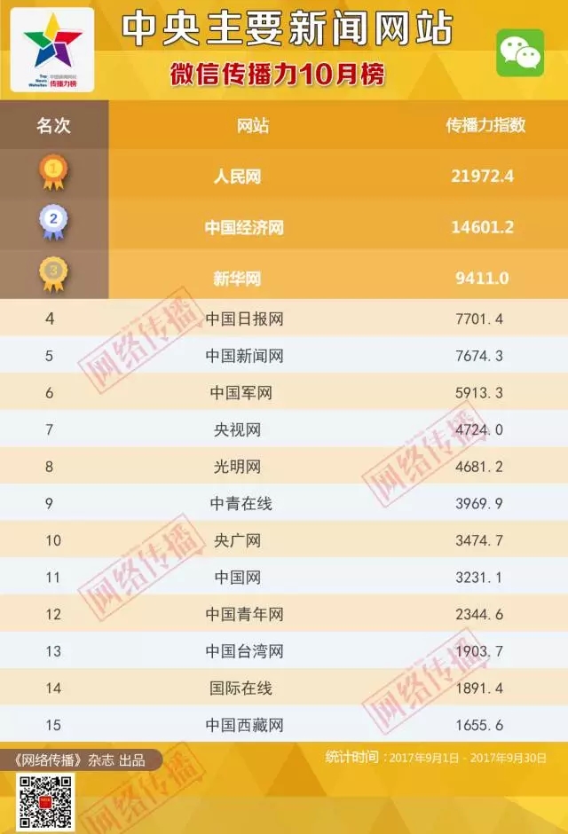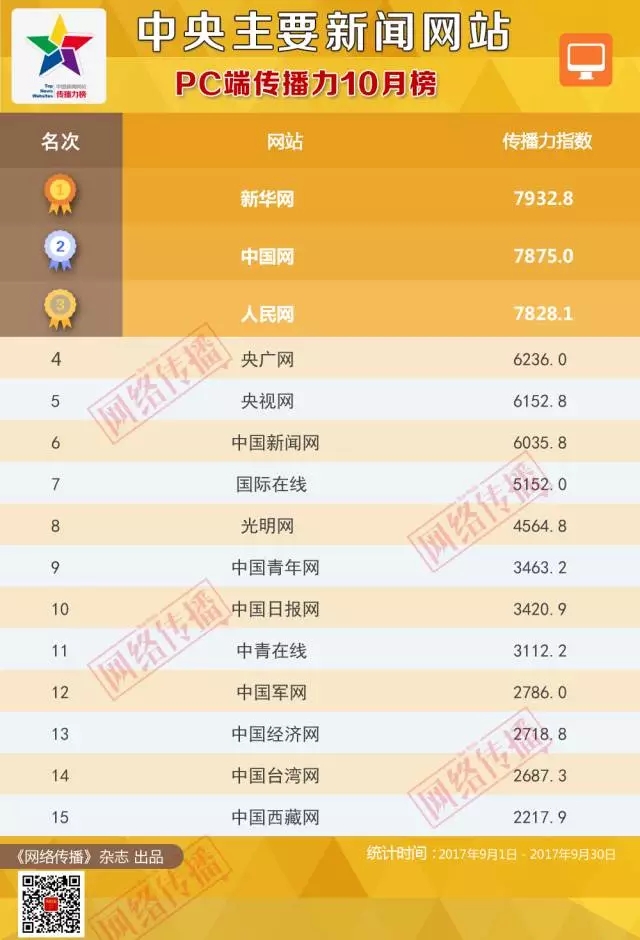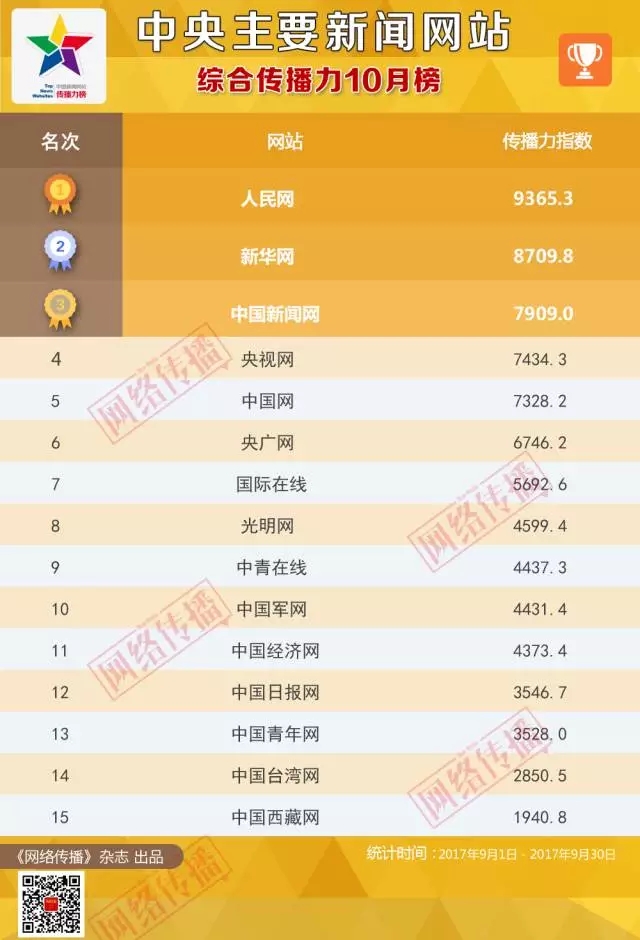 中央主要新聞網(wǎng)站傳播力2017年10月榜