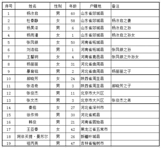 截至目前,此次火災共造成19人遇難。其中,男性11人(18歲以下6人),女性8人(18歲以下2人)。目前,專案組通過家屬辨認、DNA檢驗等手段初步確定了19名遇難者身份(附名單),涉及戶籍情況如下:山東4人、河南4人、河北4人、陜西2人、北京2人、黑龍江1人、新疆1人、吉林1人。