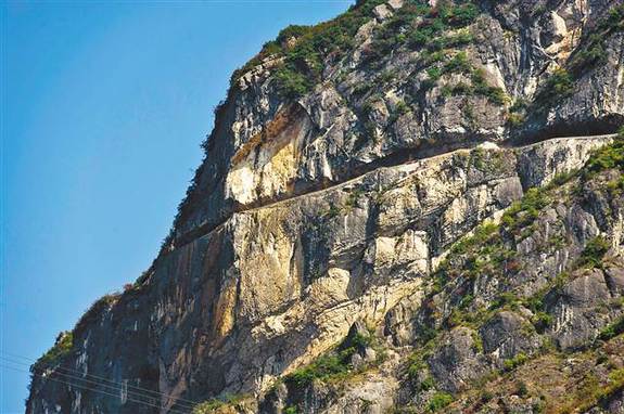 巫溪蘭英大峽谷高聳的老虎嘴崖壁上,一條崖路如腰帶般鑲嵌著。