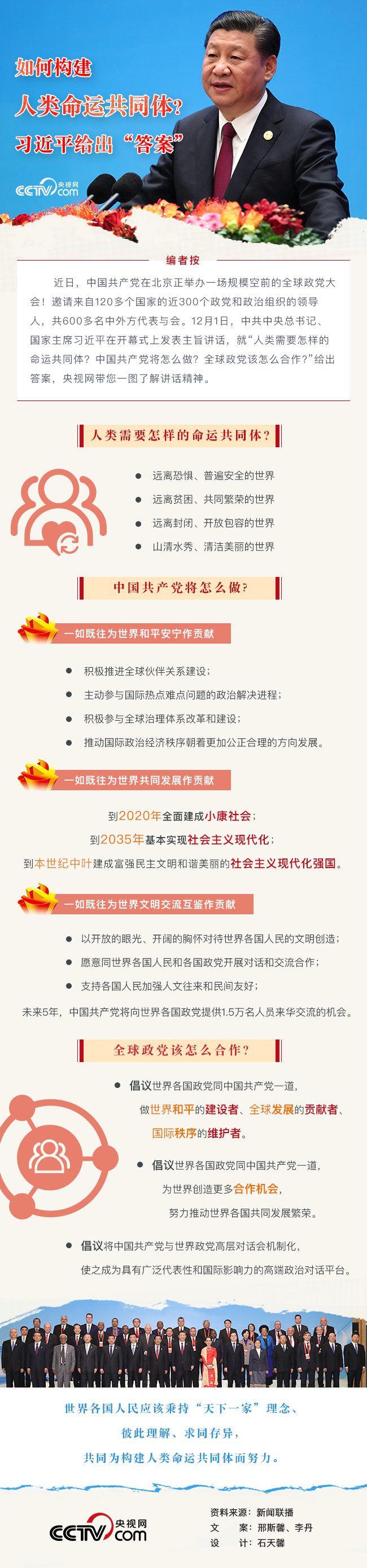 央視網(wǎng)消息:近日,中國共產(chǎn)黨在北京正舉辦一場規(guī)?涨暗娜蛘h大會(huì)!邀請來自120多個(gè)國家的近300個(gè)政黨和政治組織的領(lǐng)導(dǎo)人,共600多名中外方代表與會(huì)。12月1日,中共中央總書記、國家主席習(xí)近平在開幕式上發(fā)表主旨講話,就“人類需要怎樣的命運(yùn)共同體?中國共產(chǎn)黨將怎么做?全球政黨該怎么合作?”給出答案,央視網(wǎng)帶您一圖了解講話精神。