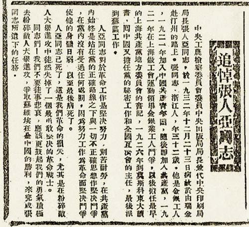 1933年1月7日《紅色中華》報(bào)刊發(fā)《追悼張人亞同志》,圖片來自黨建網(wǎng)