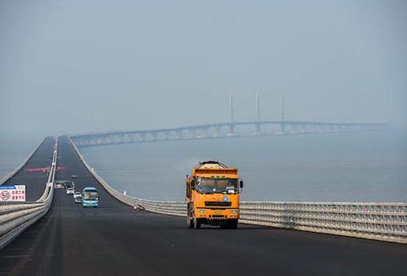 一輛運輸瀝青的工程車輛行駛在港珠澳大橋橋面上。(圖片來源:新華社)