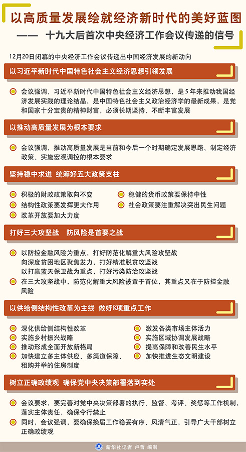 新華社北京12月20日電 題:以高質(zhì)量發(fā)展繪就經(jīng)濟(jì)發(fā)展新時代的美好藍(lán)圖——十九大后首次中央經(jīng)濟(jì)工作會議傳遞的信號