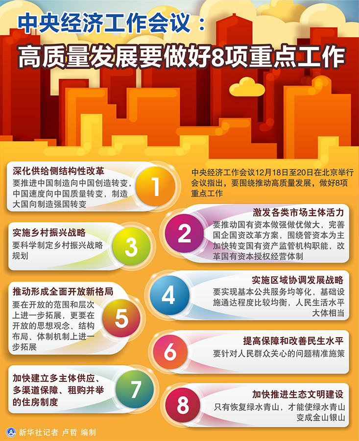 隨著十九大后首次中央經(jīng)濟(jì)工作會(huì)議閉幕,“高質(zhì)量發(fā)展”成為社會(huì)熱詞。在這一被外界視為中國(guó)經(jīng)濟(jì)“風(fēng)向標(biāo)”的重要會(huì)議上,習(xí)近平總書(shū)記發(fā)表重要講話,明確推動(dòng)高質(zhì)量發(fā)展這一根本要求,提出了8項(xiàng)重點(diǎn)工作。邁向2018,中央經(jīng)濟(jì)工作會(huì)議釋放出溫暖人心的政策信號(hào):實(shí)現(xiàn)高質(zhì)量發(fā)展,為了13億人的幸福。
