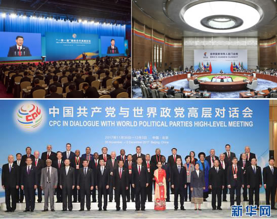 我們?cè)趪?guó)內(nèi)主辦了幾場(chǎng)多邊外交活動(dòng),包括:首屆“一帶一路”國(guó)際合作高峰論壇,金磚國(guó)家領(lǐng)導(dǎo)人廈門(mén)會(huì)晤,中國(guó)共產(chǎn)黨與世界政黨高層對(duì)話會(huì)等會(huì)議。
