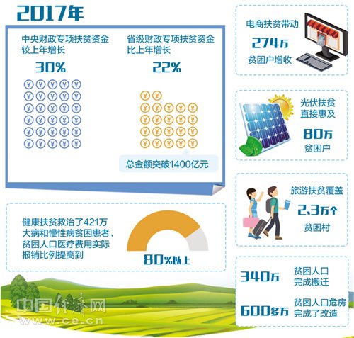 國務(wù)院扶貧辦數(shù)據(jù)顯示,2017年,中央財(cái)政專項(xiàng)扶貧資金較上年增長30%,省級財(cái)政專項(xiàng)扶貧資金比上年增長22%,總金額突破1400億元。電商扶貧帶動274萬貧困戶增收,光伏扶貧直接惠及80萬貧困戶,旅游扶貧覆蓋2.3萬個貧困村。340萬貧困人口完成搬遷,600多萬貧困人口危房完成了改造。健康扶貧救治了421萬大病和慢性病貧困患者,貧困人口醫(yī)療費(fèi)用實(shí)際報(bào)銷比例提高到80%以上。