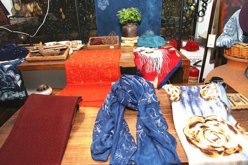 當(dāng)天,記者恰好見(jiàn)到了拾塵的合作者、草木染的傳承人之一吳華輝!八N了八千多畝的藍(lán)靛草地,現(xiàn)在很多年輕人已經(jīng)不愿意干的事情,他在干,自己也是藝術(shù)者文化者,非常難得!笔皦m說(shuō)。正是在拾塵和吳華輝的共同努力下,藍(lán)靛染已經(jīng)有多達(dá)22個(gè)藍(lán)色的漸變顏色,并通過(guò)再設(shè)計(jì),成為一件件日常穿著的衣服、圍巾。