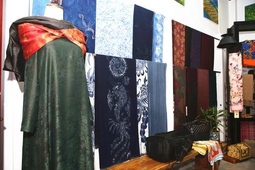 在吾瑞空間舉頭而望,天花板用草木染的布料拼貼而成。而墻上的荷花圖,在香云紗上畫(huà)油畫(huà),由拾塵首創(chuàng)。草木染布料制作的衣服,色澤純凈柔和,散發(fā)出淡淡的清香。香云紗制作的衣服,經(jīng)過(guò)再設(shè)計(jì),既復(fù)古又時(shí)尚。古法造紙制作的燈,透出古典氣息。樓梯一幅“百鳥(niǎo)圖”,由100位傳承人繪畫(huà)而成,最小的年僅三歲。