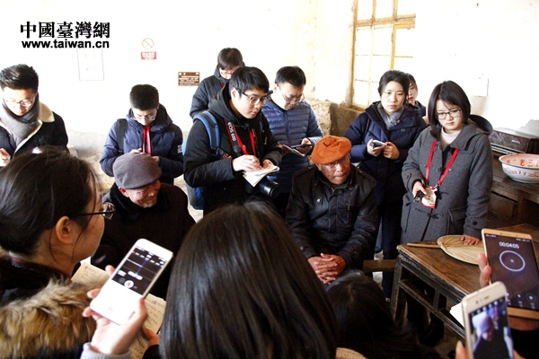 記者們在“當(dāng)年農(nóng)家”采訪“大包干”帶頭人嚴金昌(頭戴灰色小帽者)與當(dāng)年一起“大包干”的農(nóng)民(中國臺灣網(wǎng) 王鑫 攝)