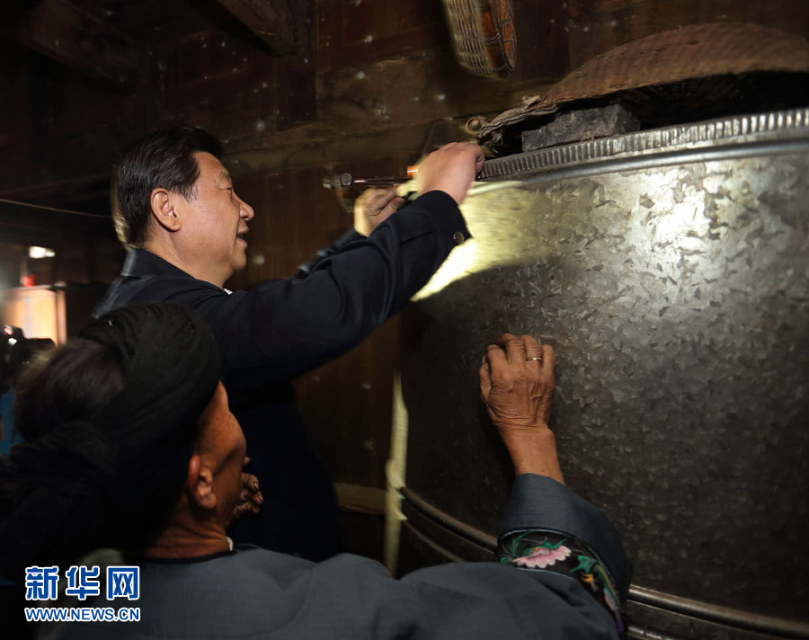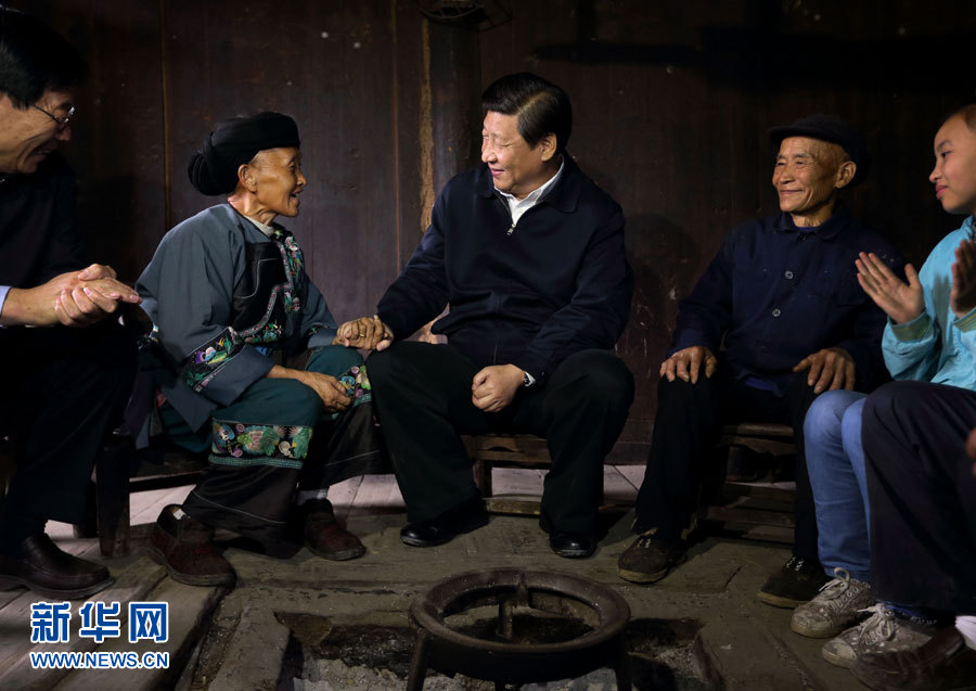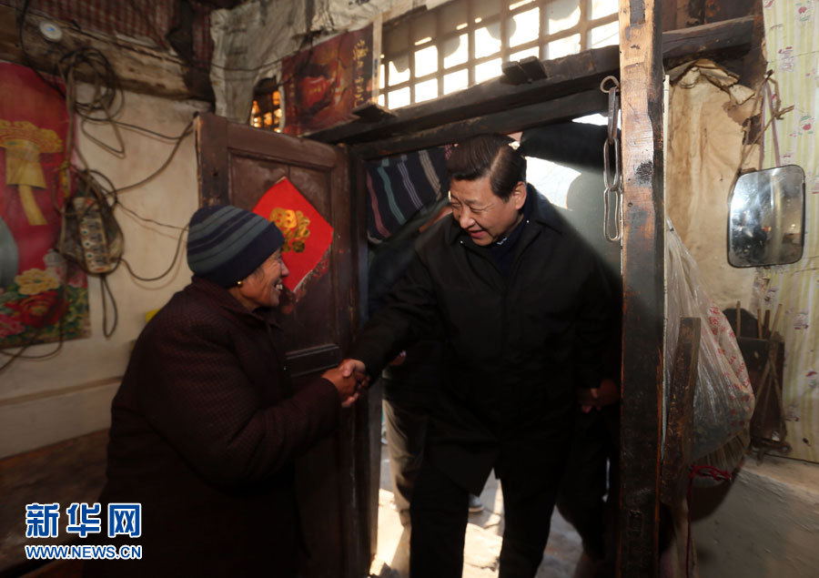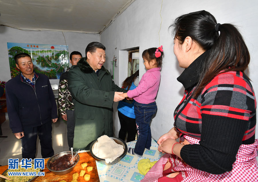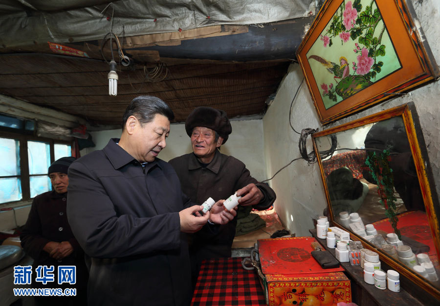 在河北阜平龍泉關(guān)鎮(zhèn)駱駝灣村困難戶唐榮斌家,習(xí)近平拿起桌上的藥瓶仔細查看,囑咐老人多多保重身體。
