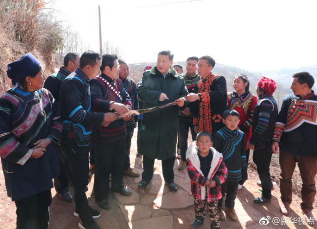 【彝族同胞向習總書記敬獻查爾瓦,唱起《留客歌》】離開昭覺縣解放鄉(xiāng)火普村時,村里的男女老幼排起長長的隊伍,同總書記依依惜別。村黨支部書記向總書記獻上彝族傳統(tǒng)服飾查爾瓦,表達對總書記的愛戴和感激?倳浬砼闋柾撸l(xiāng)親們握手道別!傲暱倳浛ㄉ成常ㄖx謝)”“習總書記庫史木撒(新年好)”“習總書記子莫格尼(吉祥如意)”,問候和祝福聲此起彼伏。隊伍里有人唱起彝族民歌《留客歌》,鄉(xiāng)親們跟著唱了起來。深情的歌聲表達了彝族同胞對黨的感恩之情,唱響了對美好生活的無限憧憬。(記者:霍小光 攝影:鞠鵬、謝環(huán)馳)