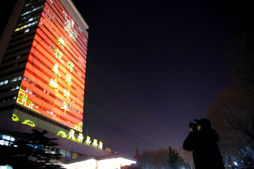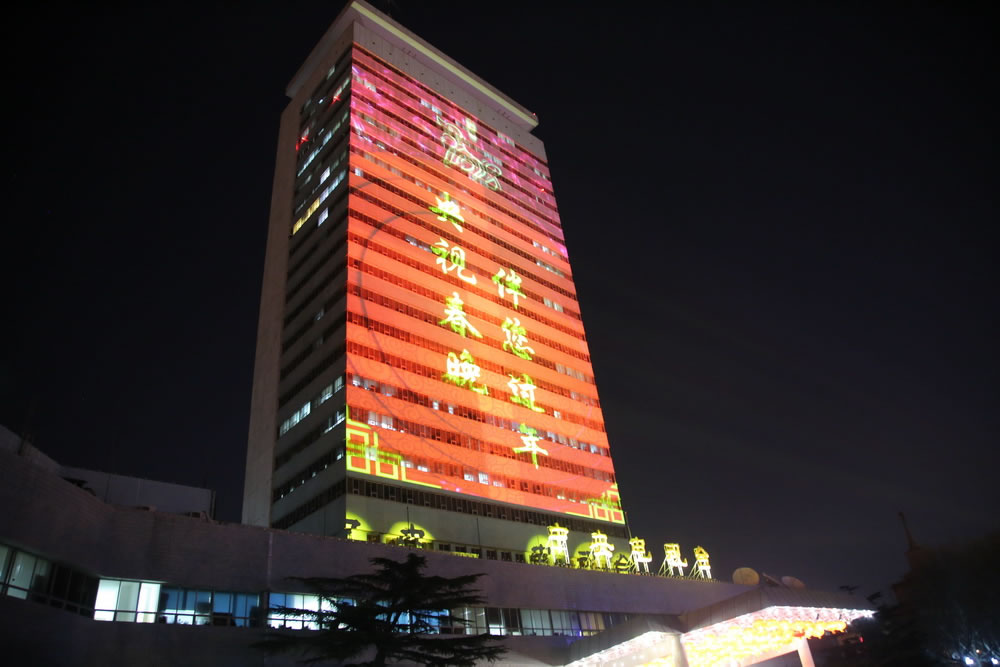 2月12日開始,中央電視臺在復(fù)興路辦公區(qū)主樓展示燈光秀,分為“祝福新時代”“央視春晚伴您過年”“春節(jié)好”三個篇章。燈光秀將持續(xù)到春節(jié)期間。