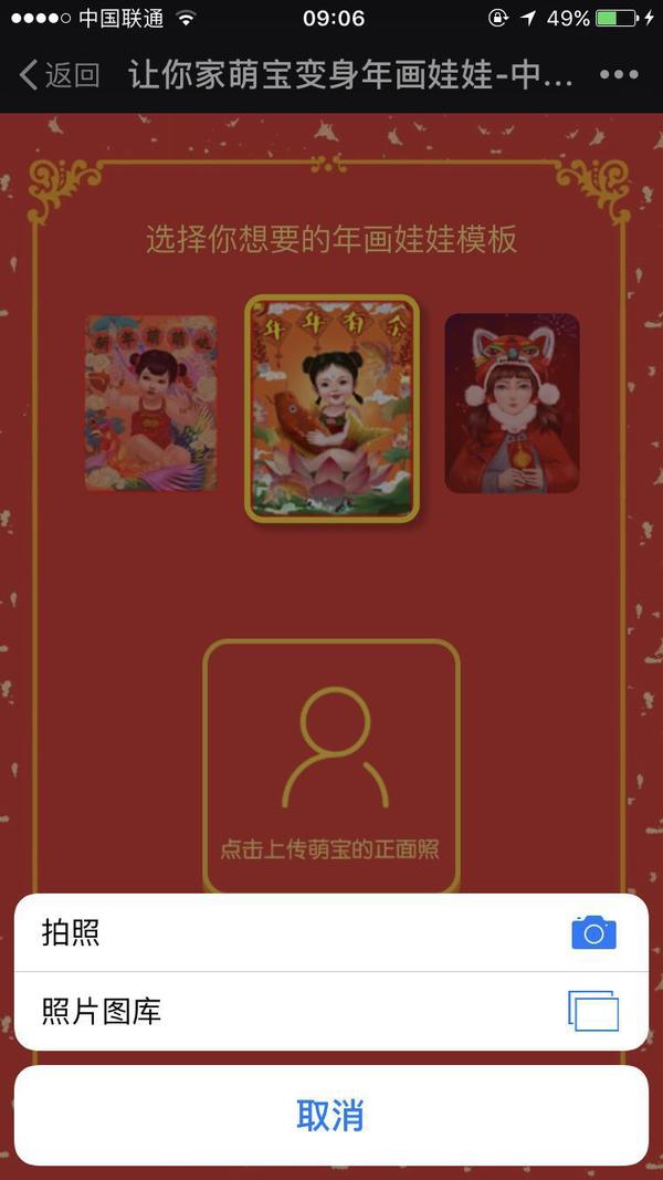 這就是我們推出的新年神器——讓“萌寶”變身年畫娃娃,上傳寶寶or自己or腦公的照片,就可以生成屬于自己的年畫照了。