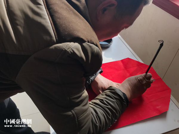 2月15日,邯鄲市永年區(qū)許莊村,記者張亞靜的父親正在書寫春聯(lián)。(中國臺灣網(wǎng) 張亞靜 攝)