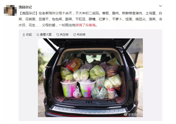 昨日,游子們從家這個港灣里,鳴笛啟航,奔向遠(yuǎn)方。除了對鄉(xiāng)愁的百轉(zhuǎn)千回,更有親情的濃郁化不開。這幾天,網(wǎng)友們都在微博里曬圖,“媽媽給裝的后備箱”的話題,一時成了熱點——“親手做的馬蹄糕”“最愛的家鄉(xiāng)小柚柑”“一大罐子土榨花生油”“秋天腌的糖蒜”……后備箱被爸媽塞得滿滿的,不愿帶還不高興。于是乎,調(diào)皮的網(wǎng)友留言:“明年我開個貨車回來過年!”