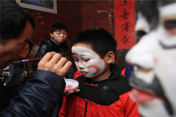 孩子們頭戴長巾,身穿“五猖服”,臉涂紅、白、黑三色,手握鋼叉,號稱“五猖兵馬”,象征正義之神。早飯后,開始第一次巡邏,大人們鳴鑼擊鼓,“五猖兵馬”在各家各戶之間往來呼喚,驅(qū)趕“狐貍夜貓”,好不熱鬧!