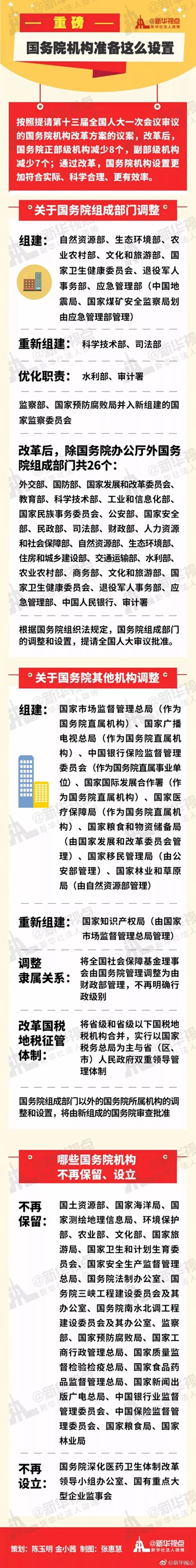 按照提請第十三屆全國人大一次會議審議的《國務(wù)院機構(gòu)改革方案》,改革后,國務(wù)院正部級機構(gòu)減少8個,副部級機構(gòu)減少7個。具體改革方案請看長圖: