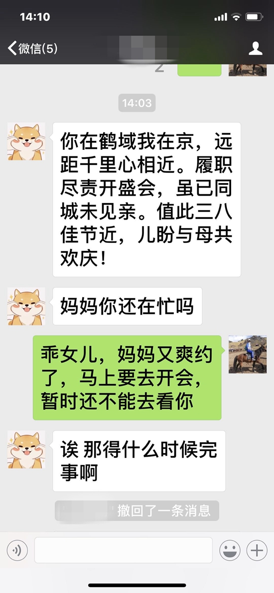“你在鶴城我在京,遠(yuǎn)距千里心相近。履職盡責(zé)開盛會,雖已同城未見親。值此三八佳節(jié)近,兒盼與母共歡慶!”