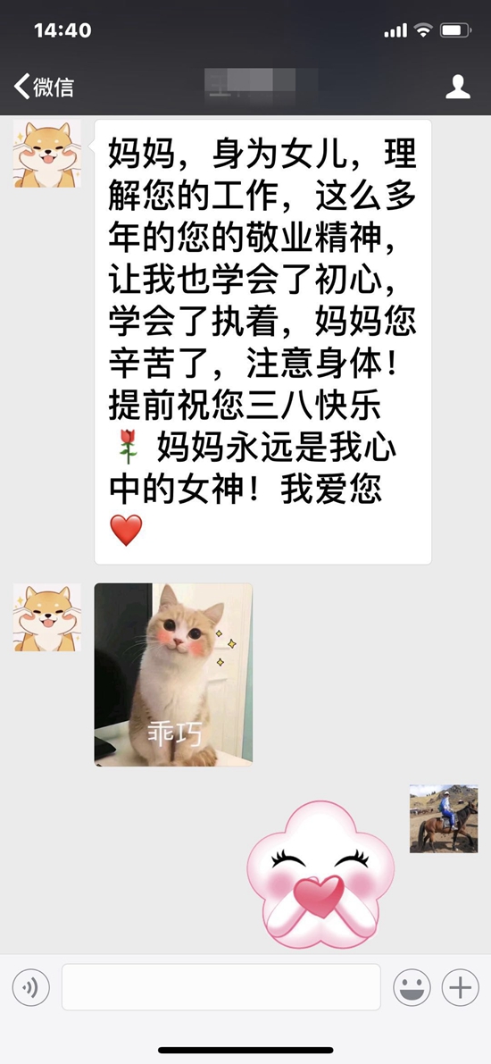 半個多小時后,女兒又給她發(fā)微信說:“媽媽,身為女兒,理解您的工作,這么多年的您的敬業(yè)精神,讓我也學(xué)會了初心,學(xué)會了執(zhí)著,媽媽您辛苦了,注意身體!提前祝您三八快樂(一枝玫瑰花)媽媽永遠(yuǎn)是我心中的女神!我愛您(一顆紅心)”。